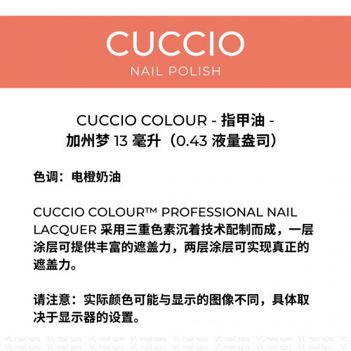 Cuccio Colour™ Professional Nail Lacquer 采用三重色素沉着技术配制而成,一层涂层可提供丰富的遮盖力,两层涂层可实现真正的遮盖力。