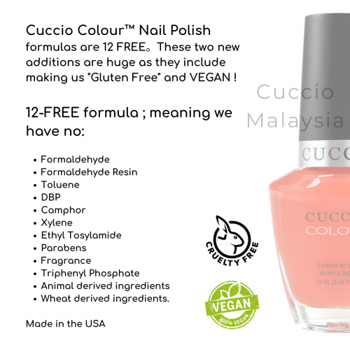 Cuccio Colour™ Professional Nail Lacquer is formulated with Triple Pigmentation Technology for rich coverage in one coat and true coverage in two coats.