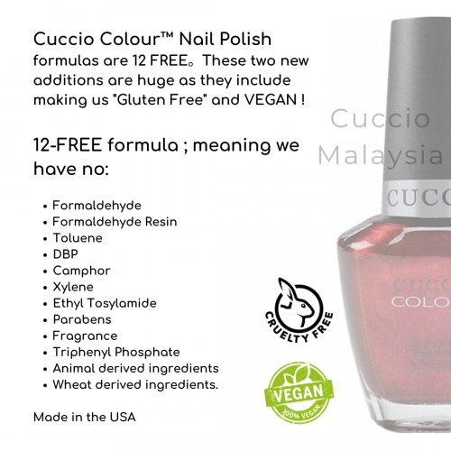 Cuccio Colour™ Professional Nail Lacquer is formulated with Triple Pigmentation Technology for rich coverage in one coat and true coverage in two coats.