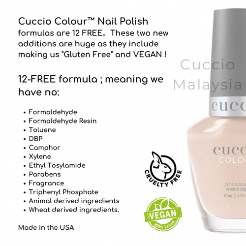 Cuccio Colour™ Professional Nail Lacquer is formulated with Triple Pigmentation Technology for rich coverage in one coat and true coverage in two coats. For the Love of Colour™ contains no DBP or toluene.