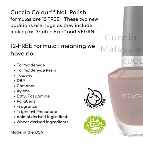 Cuccio Colour™ Professional Nail Lacquer is formulated with Triple Pigmentation Technology for rich coverage in one coat and true coverage in two coats.