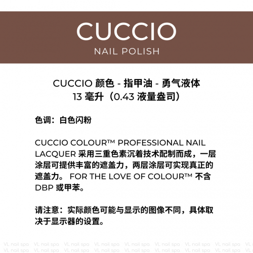 Cuccio Colour™ Professional Nail Lacquer 采用三重色素沉着技术配制而成,一层涂层可提供丰富的遮盖力,两层涂层可实现真正的遮盖力。 For the Love of Colour™ 不含 DBP 或甲苯。