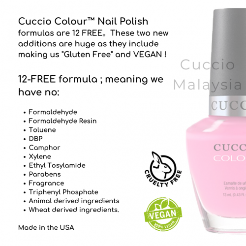 Cuccio Colour™ Professional Nail Lacquer is formulated with Triple Pigmentation Technology for rich coverage in one coat and true coverage in two coats. For the Love of Colour™ contains no DBP or toluene.